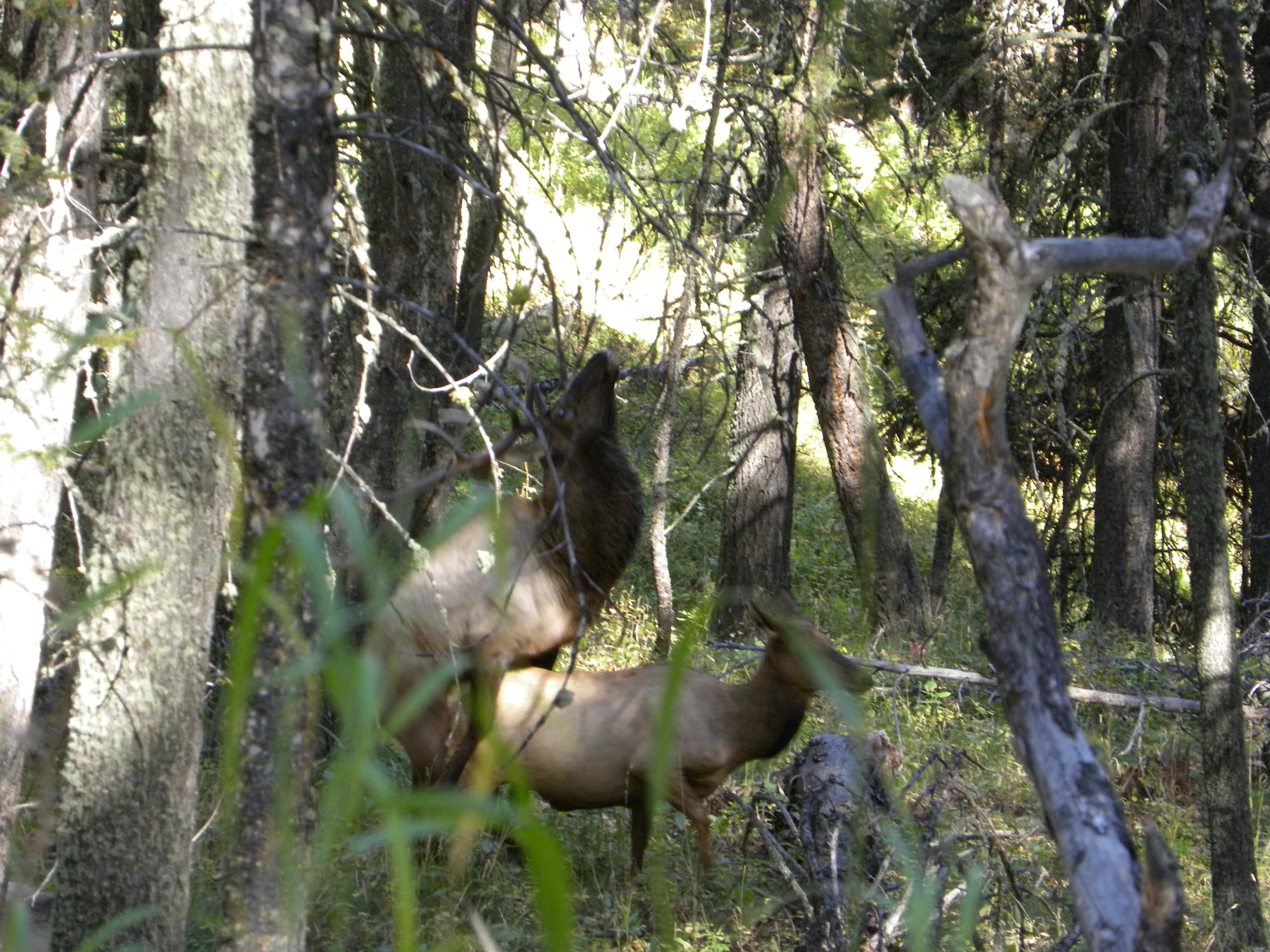 Waking up early, I soaked in the river, then headed up the trail to the Beaver ponds. Its a fairly short loop of 5 miles. Since I was early on the trail, I didn’t see anyone for the first hour. The trail winds along the open hillside overlooking Gardiner, but soon dips into a conifer glade with seeps. The day was already hot (as we’re having our summer now in fall), and as I moved into the cool shade I noticed about 20 elk, mostly cows and calves, lying around. One bull was there. This was his harem. The cows were relaxed. The calves were curious. And the bull was keyed up.