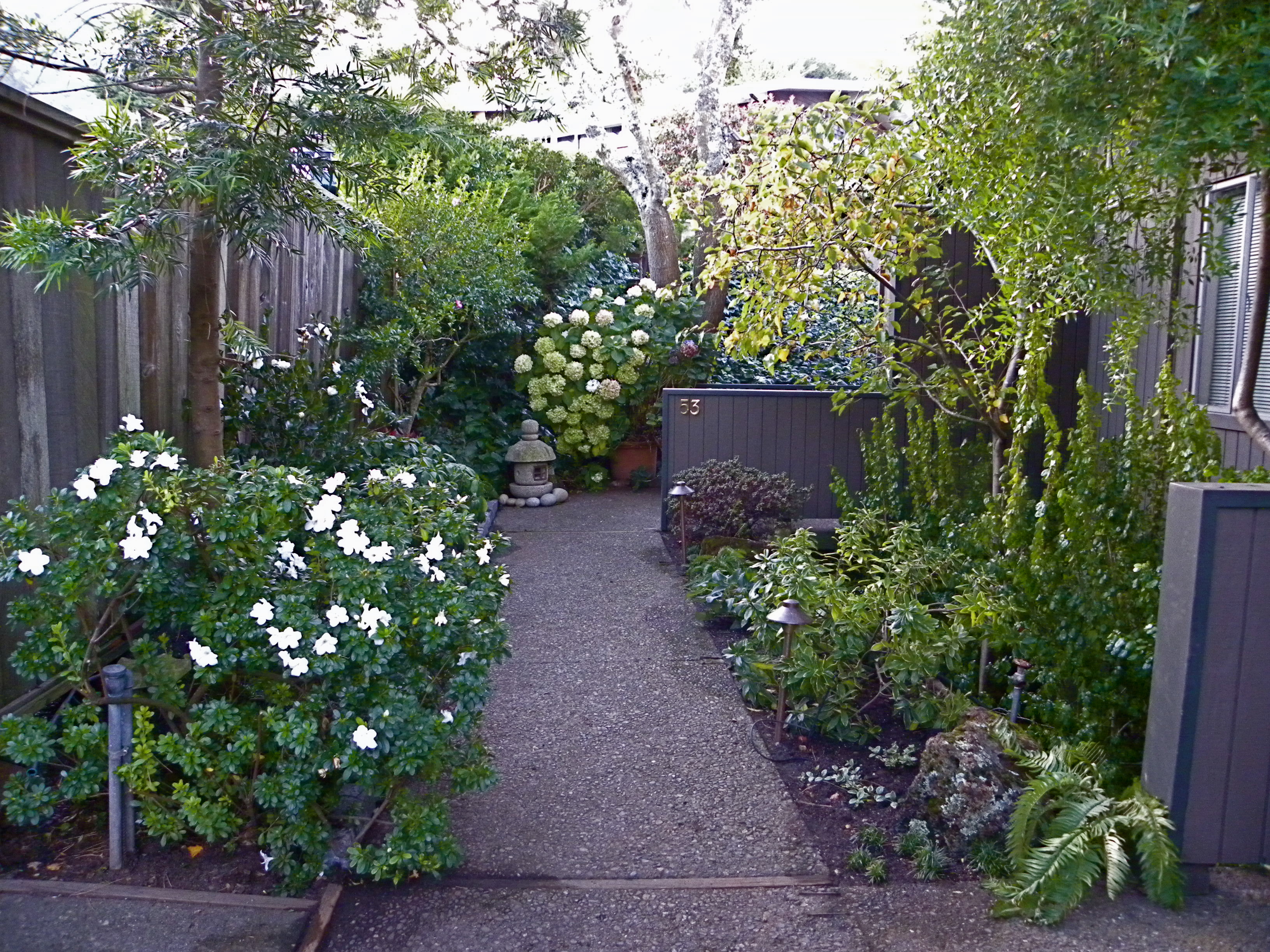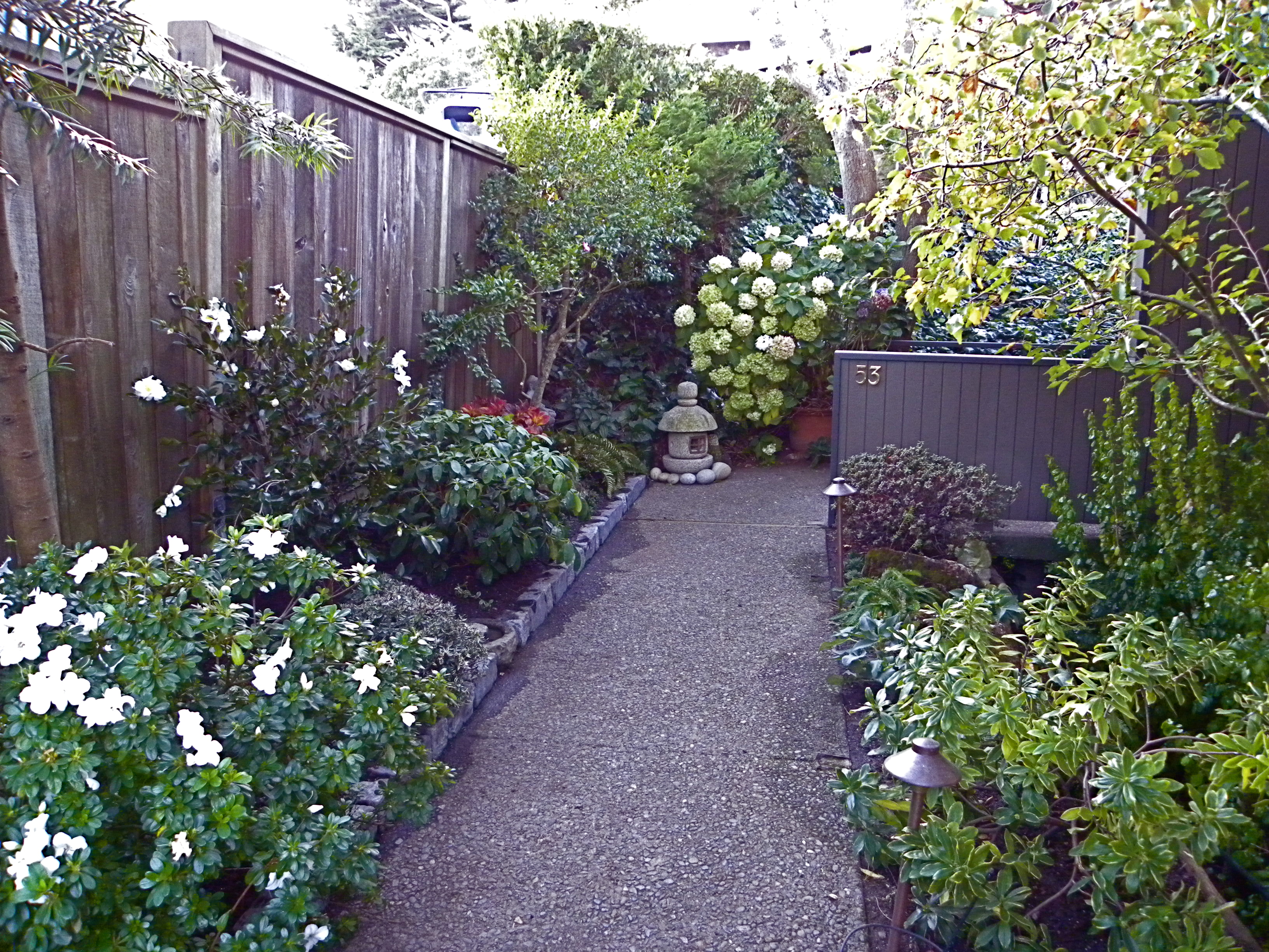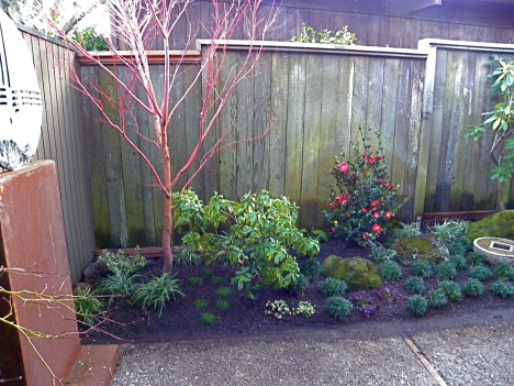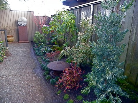 The trick with the side above was not to have plants look like they are marching in a line against the fence. There is not much depth there, but enough. The Daphne at the base of the tree is set forward to the Camellia, as are the red-leafed azaleas. The art features also help break it up. Its hard to see, but there are some dabs here and there of different textural low plants to break up the monotony of the mondo grass groundcover. Some of these are variegated white, other are red leafed oaxalis. But don’t get too busy or you risk just a confusing mass that the eye doesn’t know how to integrate.
