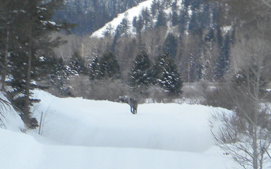 Today I took a hike along a closed winter road by the river. Tons of wolf, moose, coyote, elk, deer, rabbit and mouse tracks. I could hear a few howls across the valley, and then a pack of coyotes yelping. I stopped, listened hard, and found their direction. Somewhere by the ranger station across the river the coyotes were singing, along with the crows. I suspected there was a kill there.