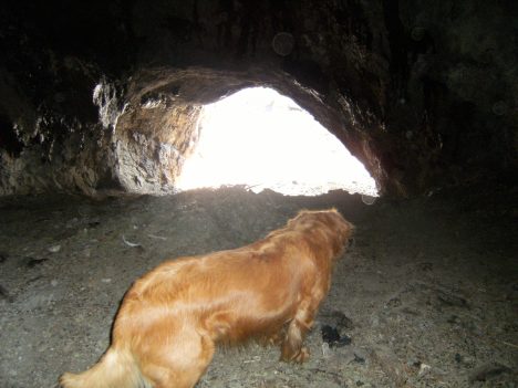At the head of the drainage where the trees were thick, the dry creek separated into two channels. I decided on the left, more narrow one. As the creek steered left sharply, I saw a hole in the rock. Right away it widened into what was obviously a massive lens-shaped cave.
