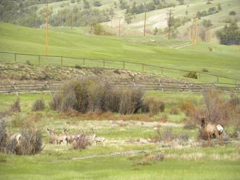 The other morning I spied a lone elk. I watched her for a few days going back and forth between the herd in the pasture and a patch of willows in the nearby forest. She’d disappear into the willows and the forest by the road and seemed concerned. I had a feeling she had a calf hidden in the brush there.