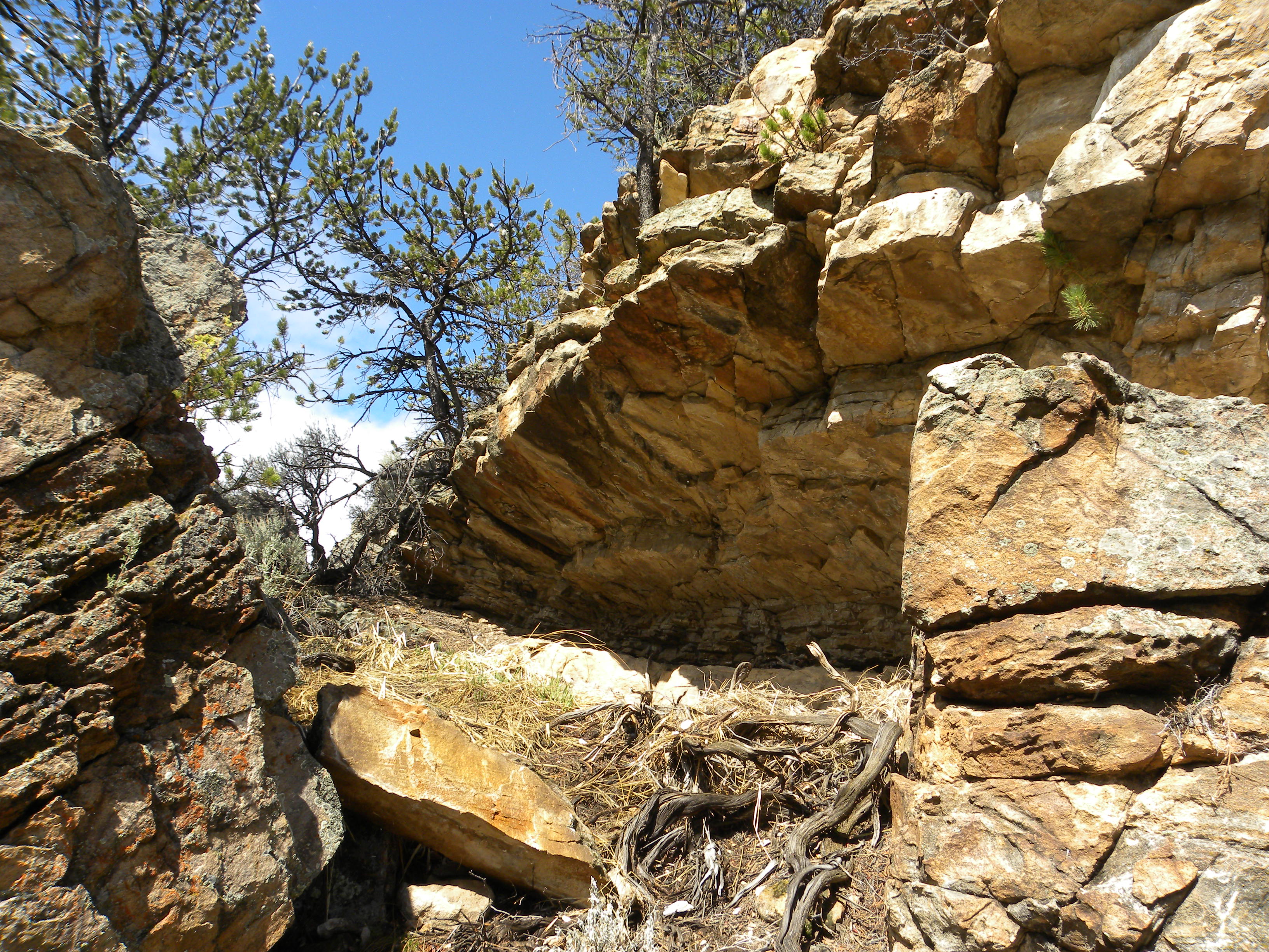Yesterday I went back to the area and ran into two older cougar deer kills.  Today I went with my camera to record them and inspect them better.  First I headed to a small rock ledge where the cougar obviously dragged his kill.