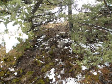 Now after I left this spot I’d found yesterday, I ran into three more old stashed kills in the same general area.  Wow, cougars are an efficient killing machine.  All these other sites were old and had one thing in common that was interesting:  all the sites had a lot of plucked hair and had covered mounds.  Underneath all these covered mounds was only hair, no bones or carcass.  I assumed that this was where the carcass was first dragged to, then plucked.  The carcass was moved after that for a second feeding, but only after the original area was covered.  I am perplexed why the site with no carcass remains anymore still needed to be covered.  If the carcass with covered, then re-visited and consumed, it would seem unnecessary to then re-cover it.  Under all these mounds, only fur.  A mystery yet for me to solve.