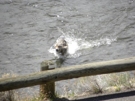 ’06 swims the Lamar river, emerges onto the road right in front of tourists.