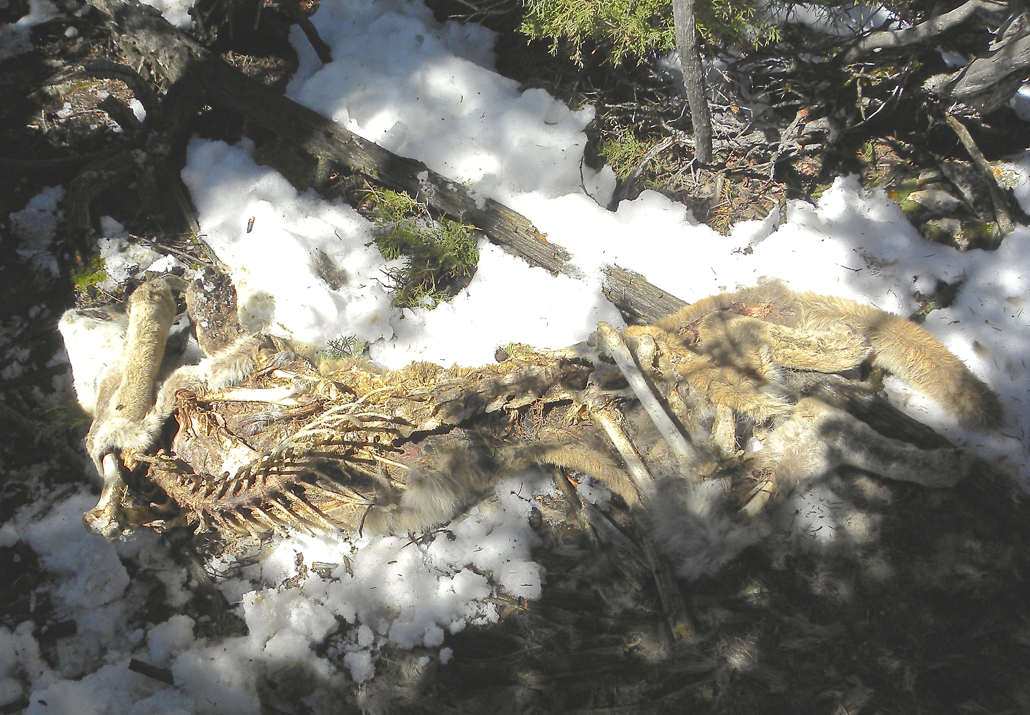 My hypothesis of the crime scene goes as such: Since I know that not only was the kill done in winter so no bears were out, there also are no bears this high up with nothing to eat. We have several wolf packs here, but they tend to follow the elk. This cougar was either displaced off of his kill by a larger male cat, or wandered into the kill and then was taken out by the other cougar. Dispersing males have a hard time. Big male cougars will keep their territory under control and will kill young males. I concluded this is what happened.