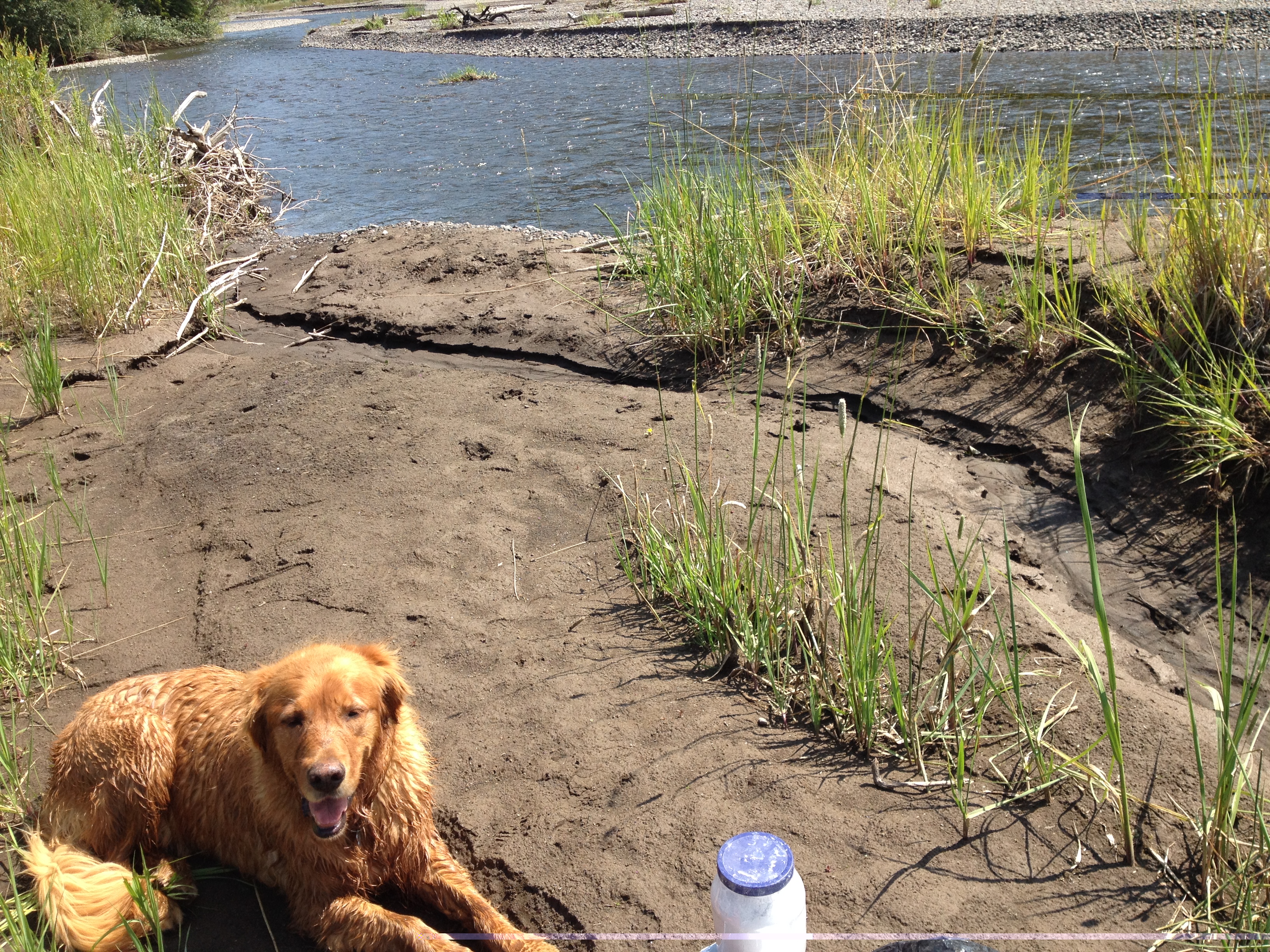 As the creeks and streams subside, now is a good time to walk the river to look for tracks. Plus when it’s hot, Koda loves it too. I put on my water sandals and shorts, stash my backpack with all the items I need to cast prints, and head for Sunlight Creek.