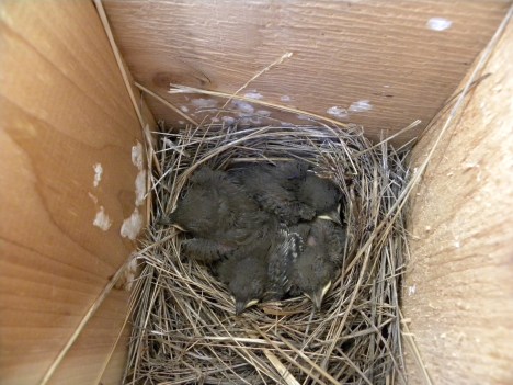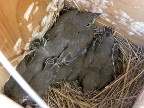 A pair of bluebirds has been nesting here for over a month. They laid a clutch around May 25 which didn’t hatch until several weeks ago (unless perhaps, when I go to inspect the box, they built a nest on top of the old unhatched eggs). From what I’ve seen and read, bluebird eggs should hatch within about two weeks so this was very unusual. I had been checking the 5 eggs every few days, till finally, on June 25, they hatched.