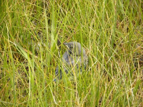 I watched the birds for the next several hours. The weasel returned for his prizes and carried them back into the hole, while the fledgling made his way through the grass uphill into deeper cover. While the upset parents kept an eye out for the weasel, they also fed and protected their only baby that was left.
