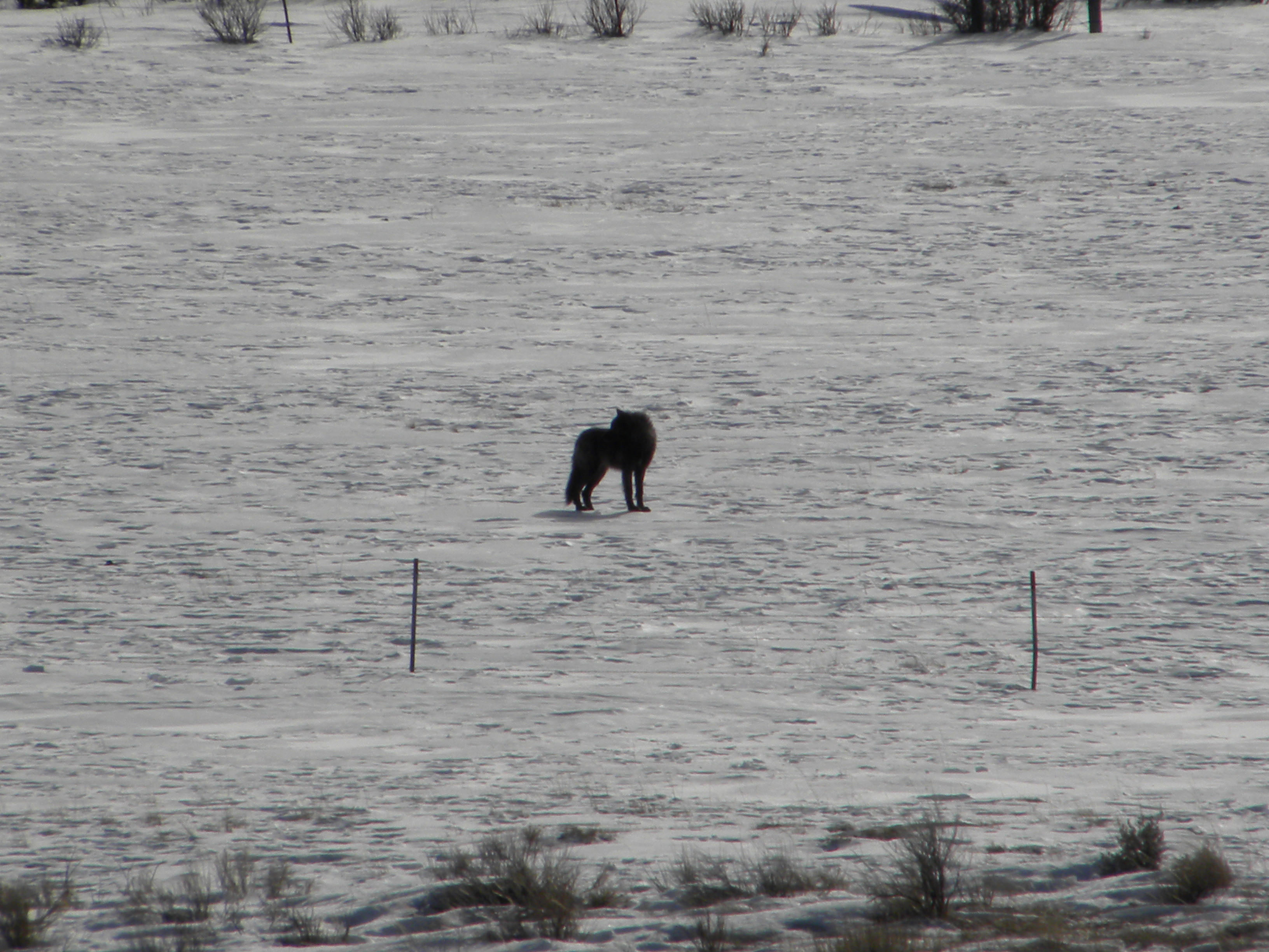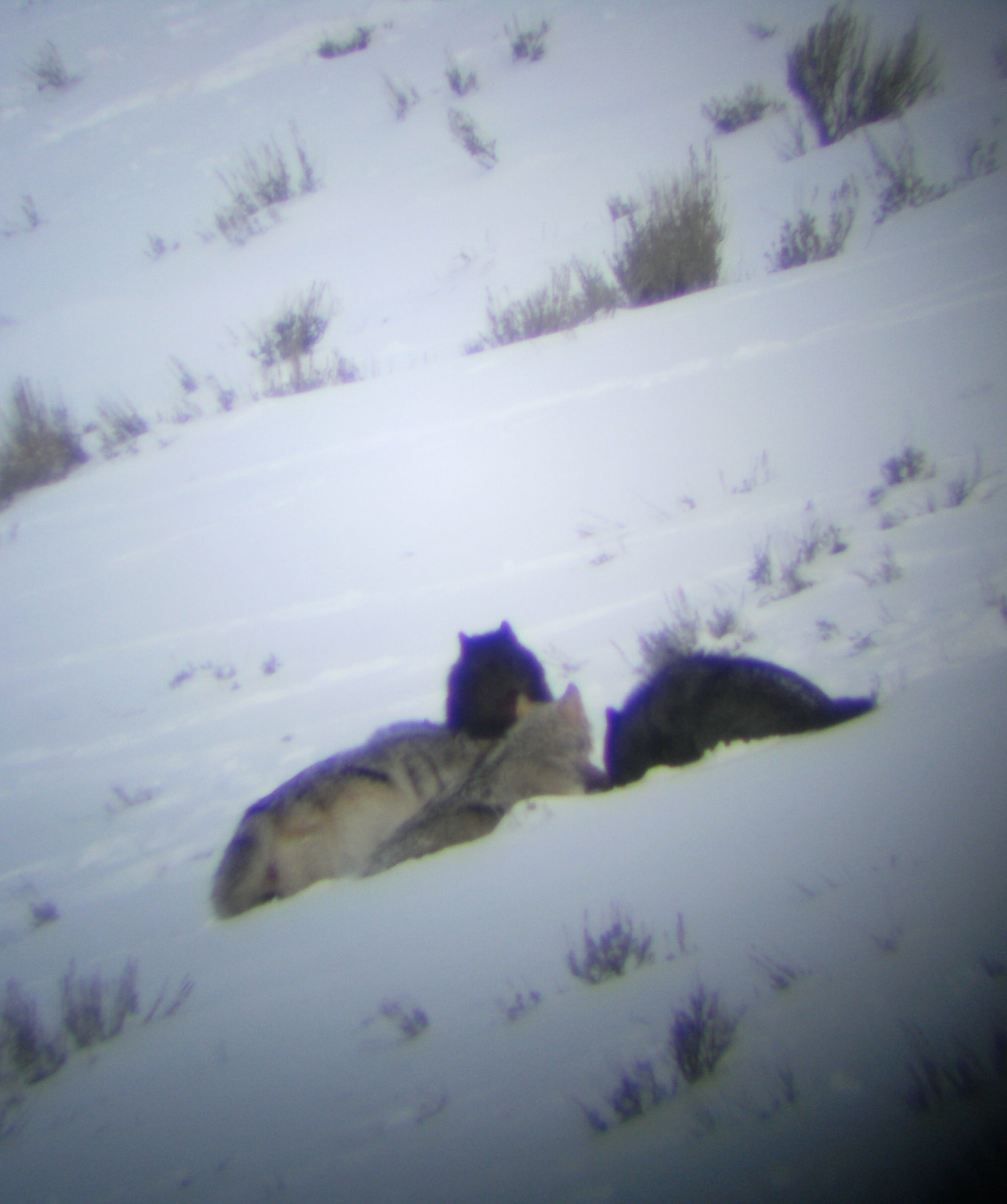 The Sunlight Pack made a kill. The Sunlight pack is about 10 strong , almost all young wolves. While they were on the kill, Ron heard some barking. At first he thought it was the ranch dogs nearby, but then here come the Absaroka Pack, mature wolves 7 strong. They pushed the Sunlight pack off the kill. While we were talking a black wolf from the Absaroka pack came checking things out.