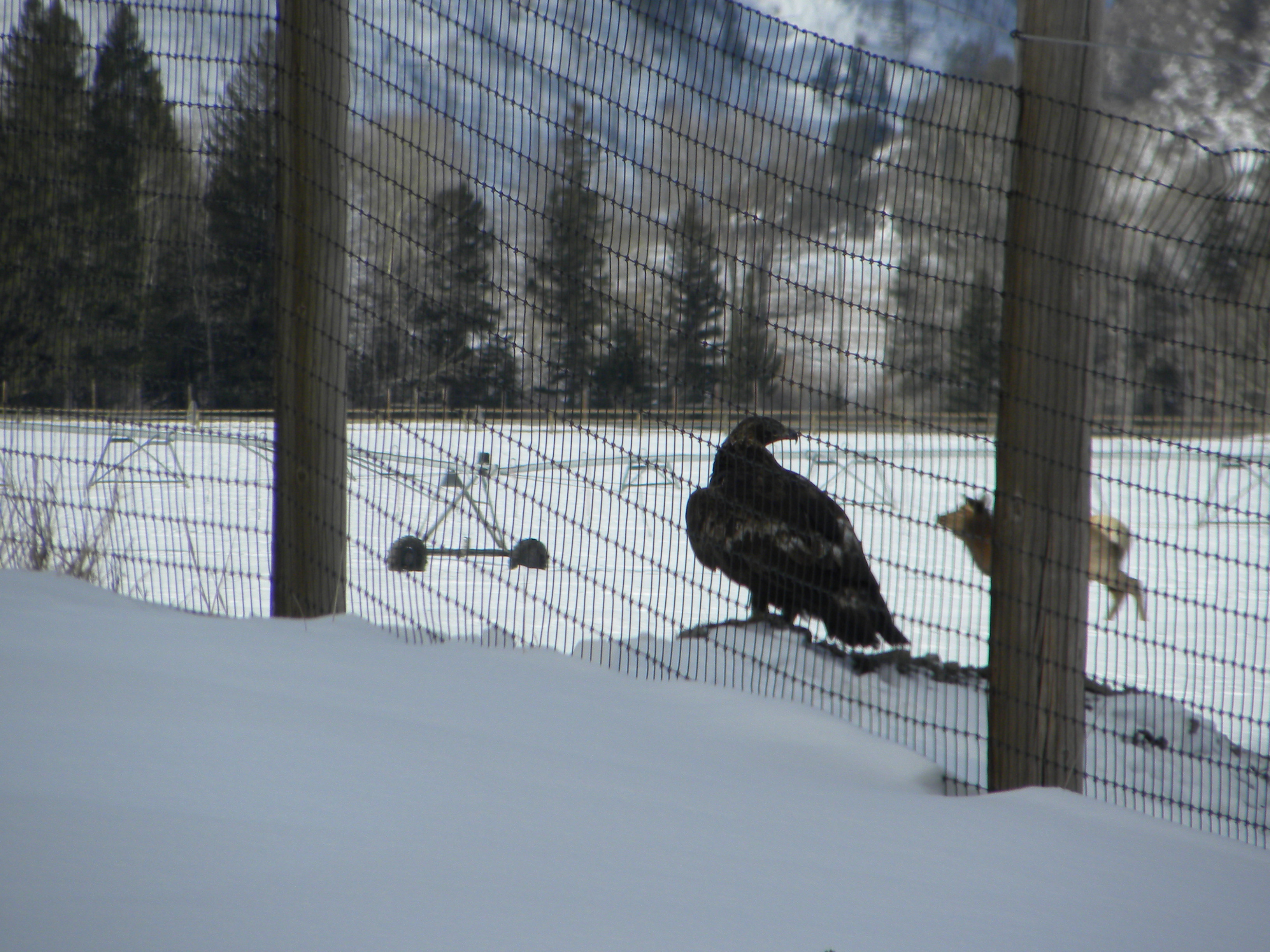 But why they were there was solved when I saw some birds circling in their winter pasture across the creek. There was a kill over there. These elk were trying to get across the private pasture and into the forest beyond but were being prevented by the fence. Now they were sitting ducks for the wolves. The road is between the fence and the forest where they wanted to head but were prevented. They were hanging around the fence line by the road and every time a car went bye, they stressed, running this way and that, confused, not conserving their energy, unable to head in any safe direction.