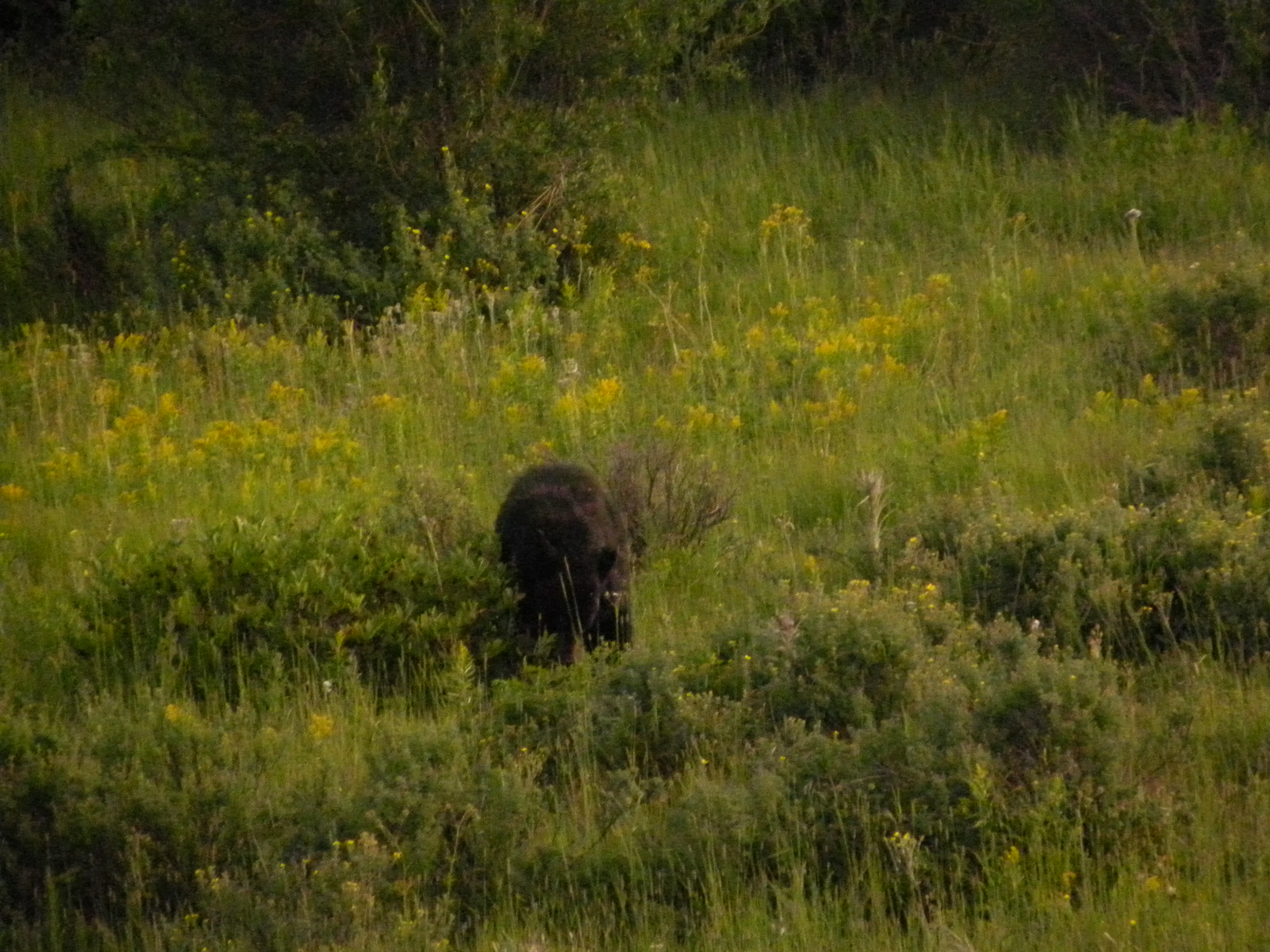 I was at the grocery store in Cody when I ran into my neighbor.  “My son heard a noise on the porch of his cabin in the middle of the night.  He looked out and saw a grizzly and 3 cubs.”  I had heard about this bear but hadn’t seen, after over 2 months of walking my woods and land, any sign of grizzly, just sign of my black bear friend.  I doubled my attention-efforts, always mindful of sign, noise, and bear spray close bye, but saw nothing after several weeks.