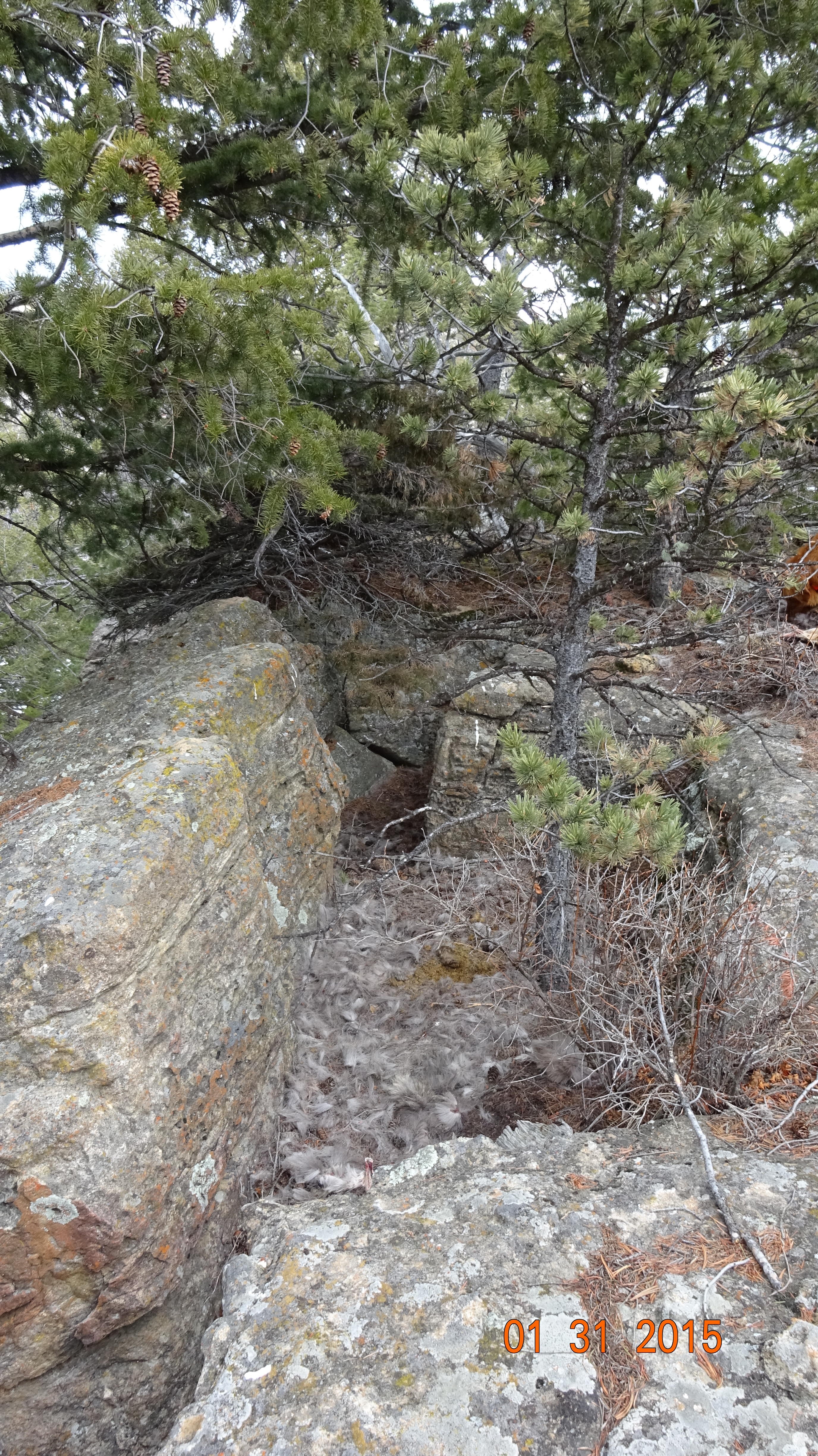 Then I began looking around for a bed site. The toilet was on the flats, but the kill had been dragged below to a small cliff area. I began investigating the rock edges. Toni had pointed out how the cats she collared in Yellowstone were traveling at the base of very high cathedral-type cliffs. I figured this cat might be doing the same. And lo and behold I found a very nice small cave–big enough for a cat to bed down in. Toni had told me that when I find these, to crawl inside and look for ‘guard hairs’, the white hairs on the belly of the cat. They apparently shed easily. Following her instructions, I found several white hairs.
