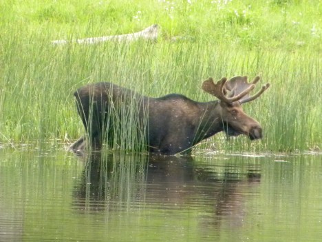 I decided to try the trail and see if it opened up. If it didn’t, I’d find another to hike. Sure enough, after about 700 yards, the trail opened to meadow and an unburned forest. As I approached the hot springs of Solfatara Creek, the trail showed lots of fresh bear sign. The creek was a beautiful and unusual greenish-blue, warm, slow water, but the mosquitos were thick. Between the bugs and the bear scat, which was thickening in tune with the mosquitos, I decided that since I was hiking alone I’d prefer to find another trail, one more open and less buggy.