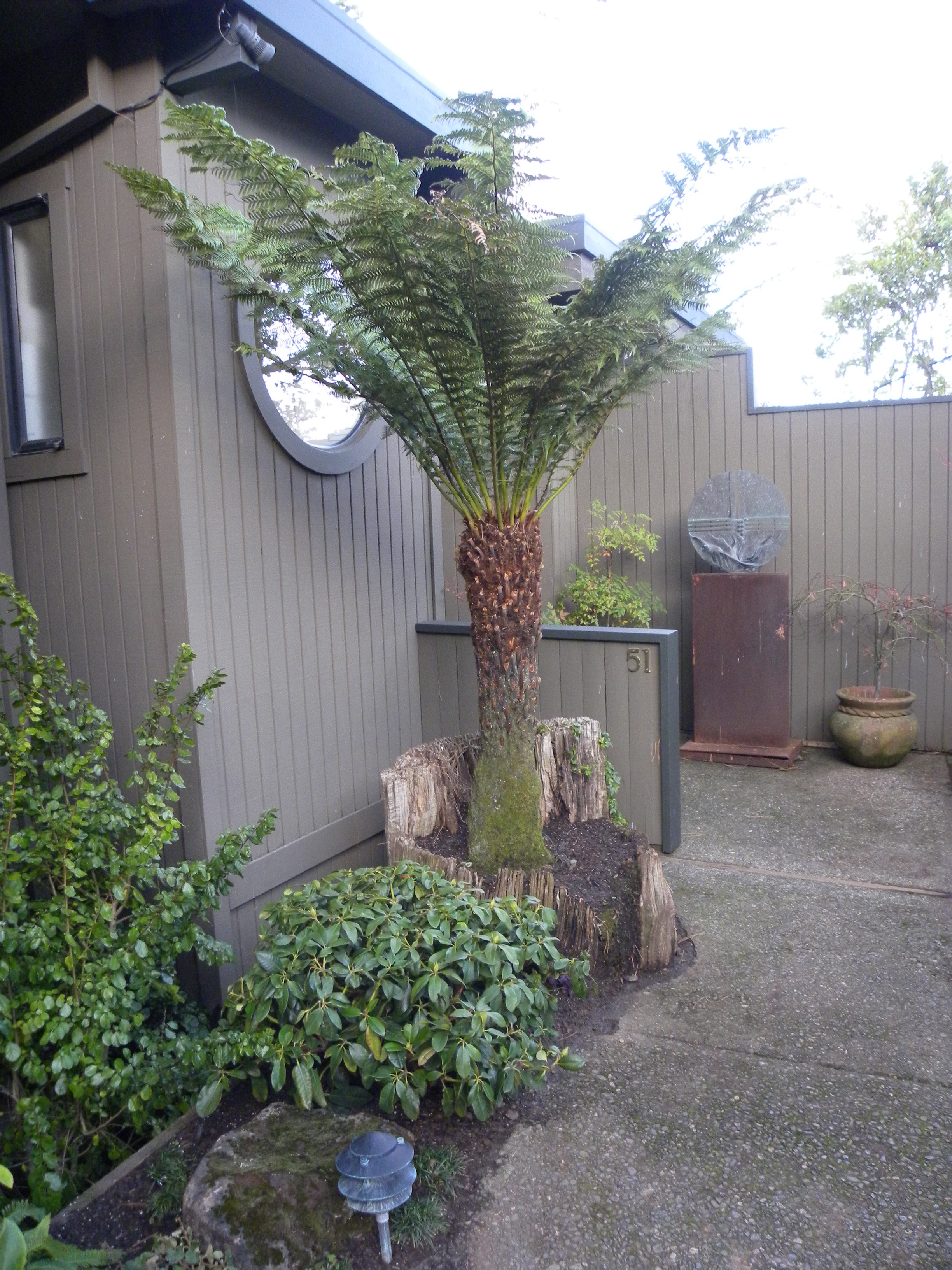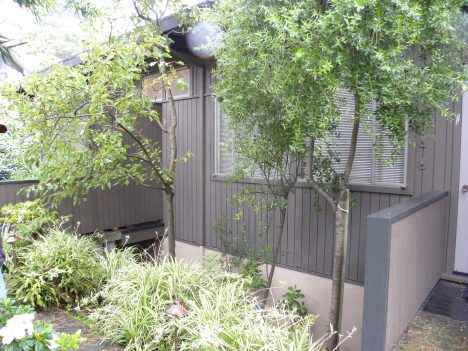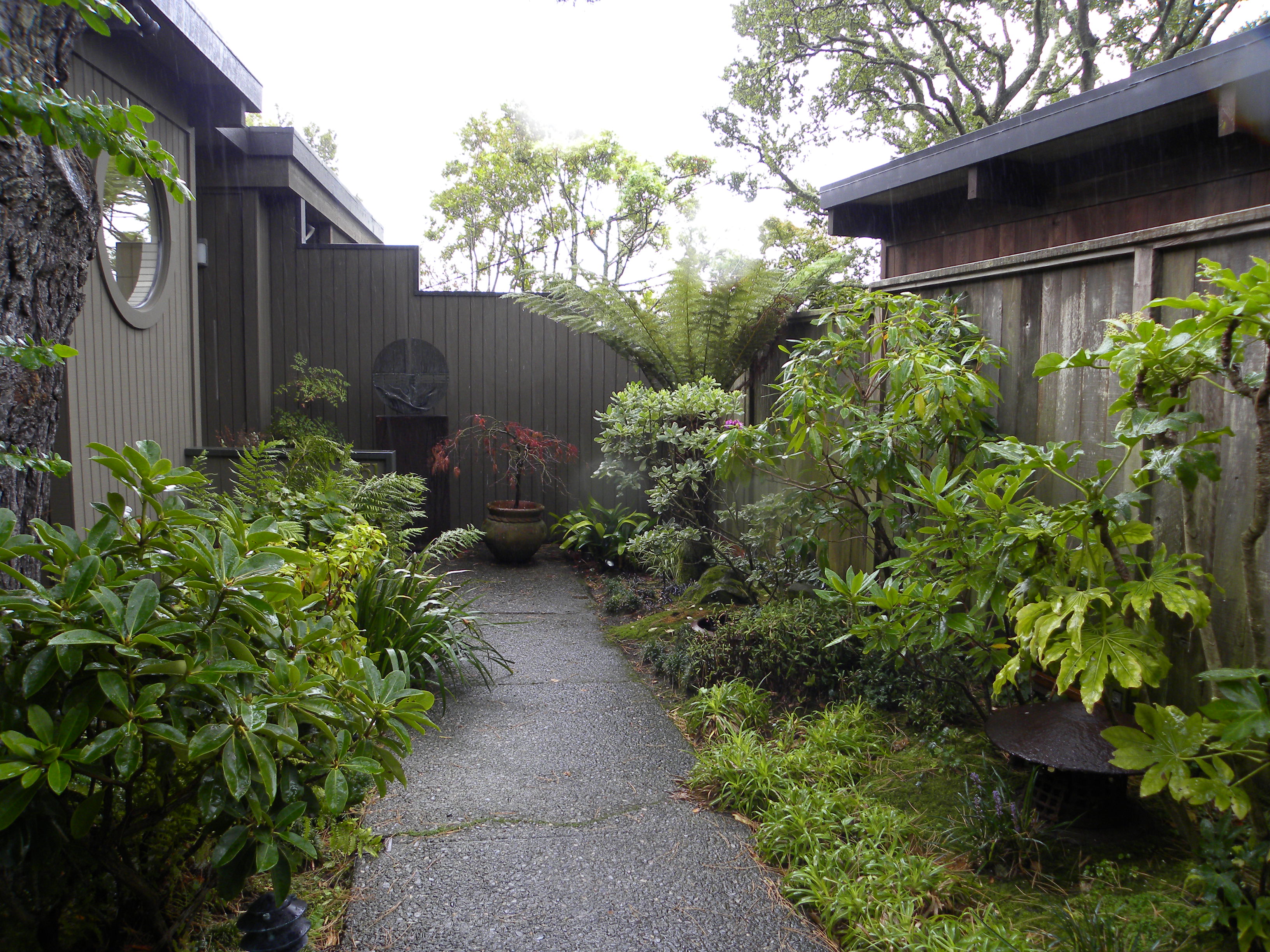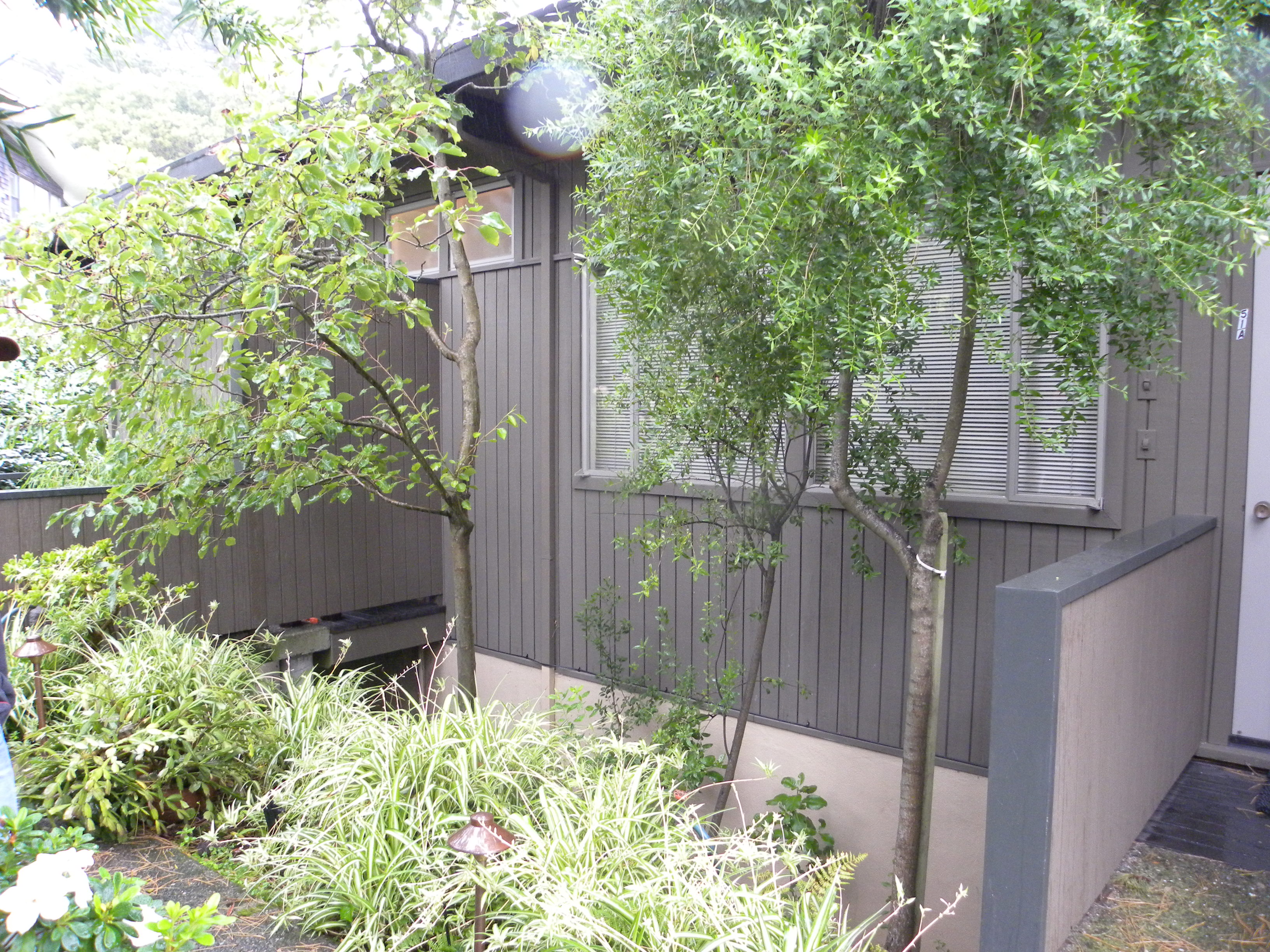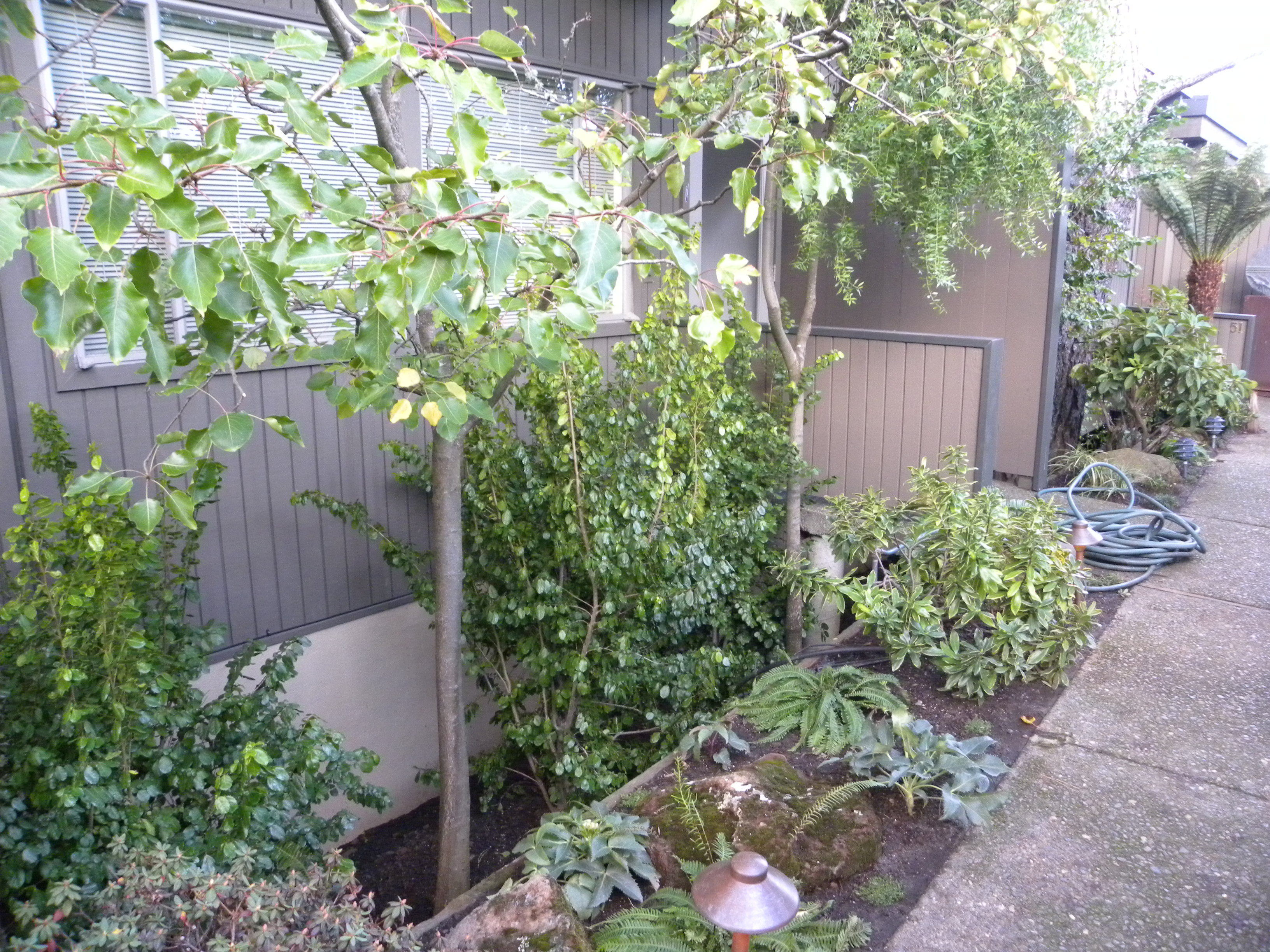 Here’s another view of the well behind the spider plants. We will clean up down below. There are two different kinds of trees. The one on the right is a Maytens. It is stunted, not correctly pruned, and doesn’t fit the space. The one on the left is an ornamental Evergreen Pear. Allowed to grow up and correctly pruned, this fits our Japanese look better. I’ll plant this area with the intention of removing the Maytens as soon as the new plant cover grows up. Not visible is a very large Monterey Pine and a Live Oak. These provide a canopy of dappled shade for our new plants.