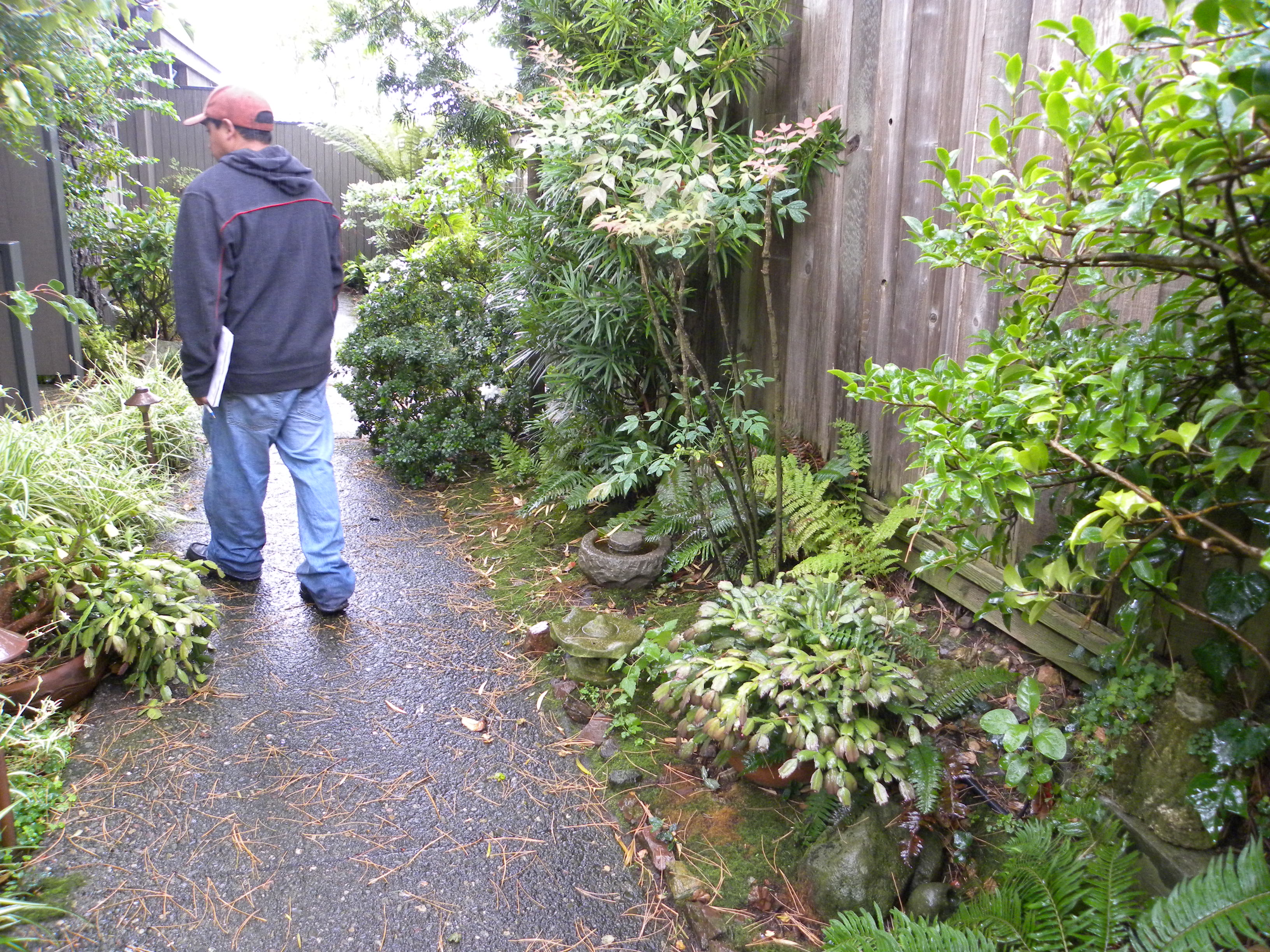 This is the owners side that I worked on a dozen years ago. A large existing tree used to be in the corner behind the fern. That was taken out several years ago by the owner. The variegated Pittosporums I installed were never pruned and are now too large and leggy. We’ll have to remove them completely now. Much of the finer ground cover like the Luzula aurea in the foreground has been allowed to take over, and the Rhododendrons were not properly pruned and are now large and leggy. We’ll discard some of the material and use others.