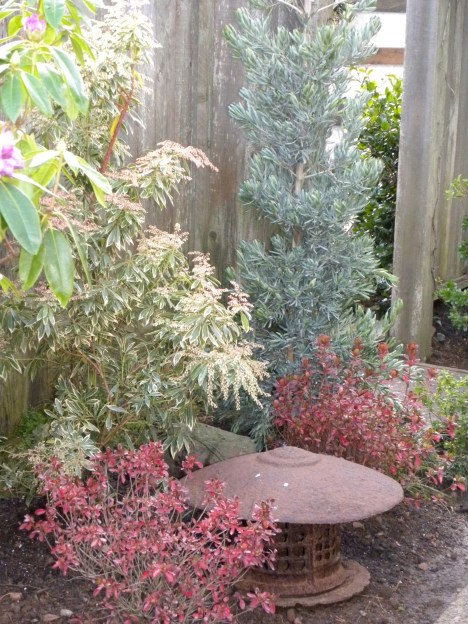 I chose a palette of Daphnes, variegate Pieris, ‘Icee Blue’ Podocarpus, Ophiopogons, Rhodies, red leafed Kurume azaleas, Preziosa Hydrangea (they have red leaves), variegated Abelia, variegated Vinca minor, some Rubus, purple-leafed Oaxalis, Japanese painted ferns and native Blechnum spicant ferns.